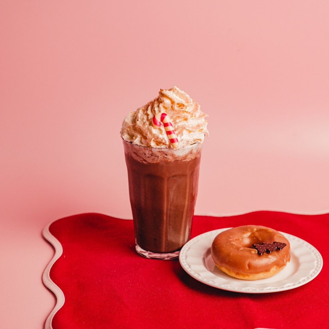 A creamy hot chocolate combining velvety milk, creamy praline, and whipped cream. Gold sprinkles and white chocolate candy canes enhance this winter treat. An invitation to indulge, ideal for a well-deserved cocooning moment.